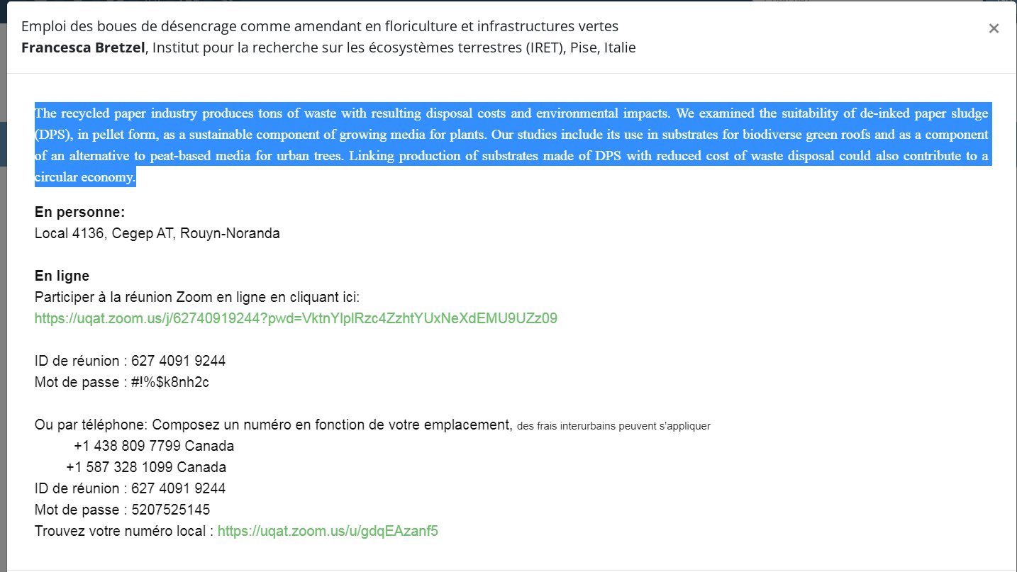 Dr. Francesca Bretzel, researcher at the Institute for Research on Terrestrial Ecosystems (IRET), Pisa, Italy and guest of the Canada Research Chair on valuation, characterization and transformation du bois at UQAT (https://crcbois.ca/) will give a presentation on the use of deinked sludge as a growing media for floriculture and green infrastructure.