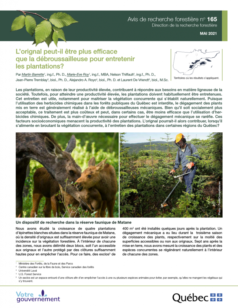 L’orignal est capable de débroussailler de façon assez efficace des plantations d’épinette blanche et pourrait être ainsi être une option intéressante dans des endroits tels que les réserves fauniques. C’est ce qu’a montré une récente étude menée par des chercheurs de la direction de la recherche forestière (MFFP), de l’Université Laval, du Centre canadien sur la fibre de bois et l’U.S. Forest Service.